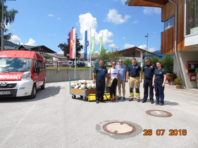 Am 26.07.2018 besuchten uns Kameraden der Feuerwehr Sinac. Nach einer kleinen Führung durch das Zeughaus der Feuerwehr Kirchberg übergab Kommandant Christoph Schipflinger zusammen mit dem Koordinator des Projektes, Peter Logar, ausgetauschte Bekleidung, Helme (inkl. Helmlampen), Taschenlampen und Gerätschaften an die Kameraden aus Kroatien. Im Anschluss wurde noch gemeinsam Mittag gegessen.